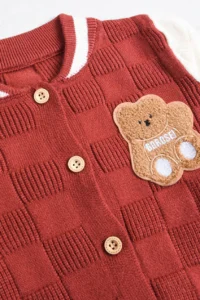 Design: Red checkered cardigan with striped cuffs and teddy patch, paired with matching striped-cuff trouser..