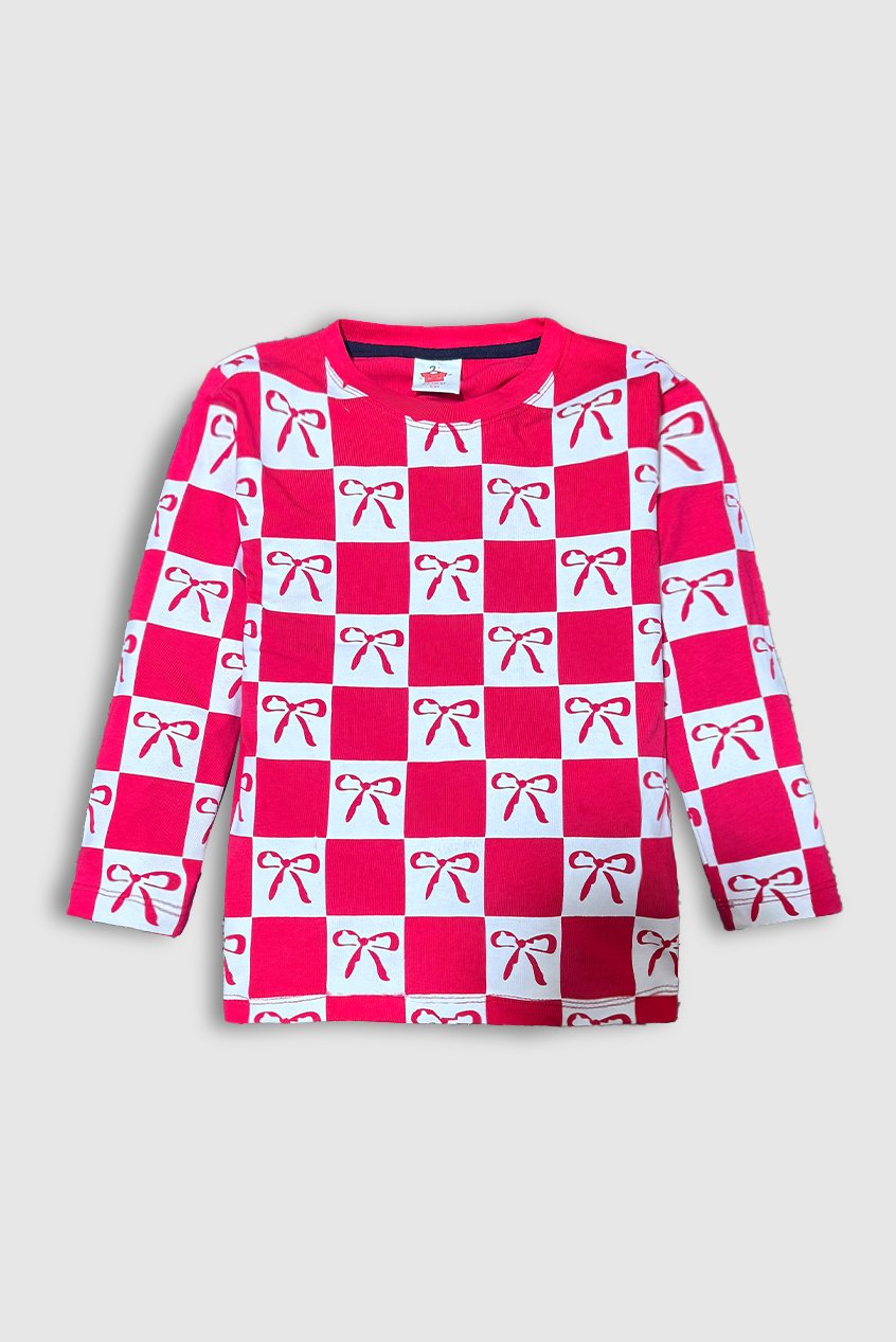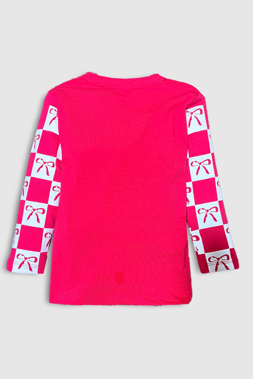 Design: Red checkered cardigan with striped cuffs and teddy patch, paired with matching striped-cuff trouser..