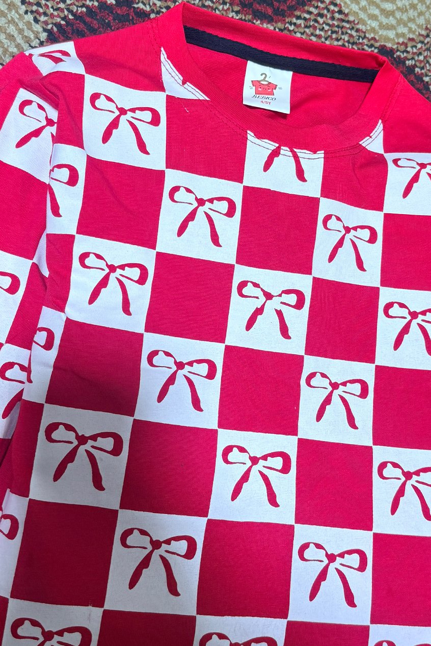Design: Red checkered cardigan with striped cuffs and teddy patch, paired with matching striped-cuff trouser..